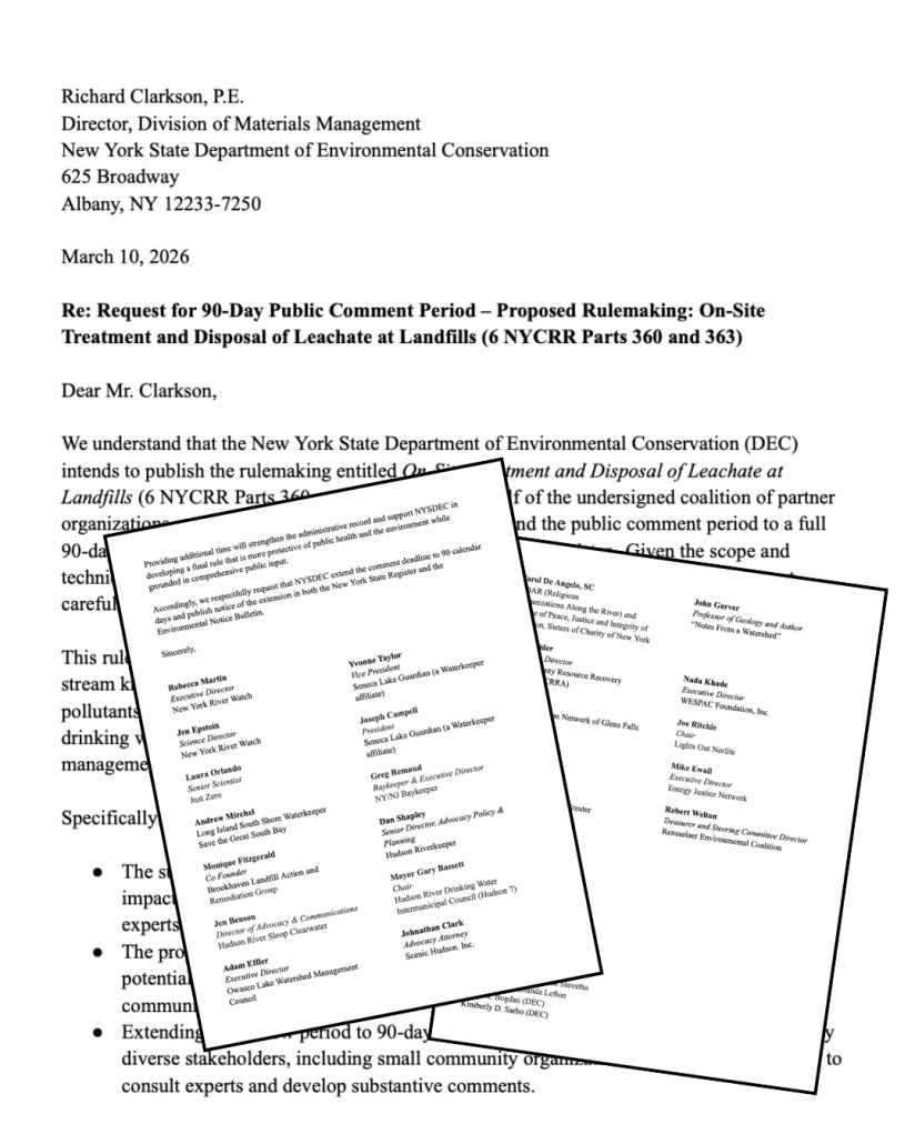 Today, 21 environmental and community organizations sent a letter to the New York State Department of Environmental Conservation (NYSDEC) asking the agency to provide a 90-day public comment period for its upcoming rule on how landfill leachate is treated and disposed of.